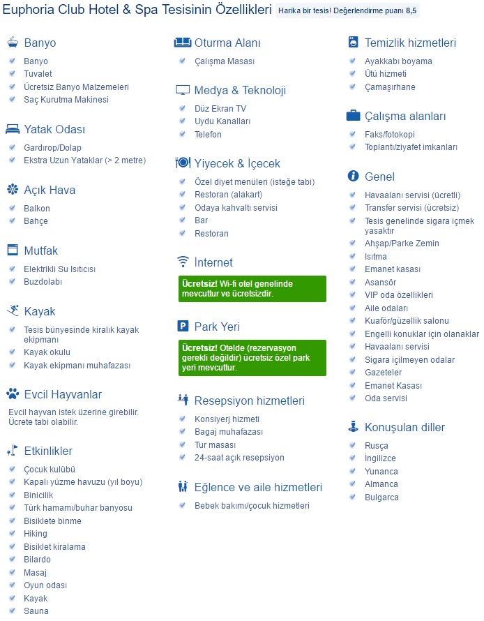 Euphoria Club Hotel'in daire ve villalarının tümünde kayak malzemelerini depolama olanağı sunulmaktadır. Otelin 2 km ötesindeki teleferiğe ücretsiz servis ile ulaşabilirsiniz. Borovets'in merkezi 1,5 km mesafededir. Konuklar araçlarını otelde ücretsiz olarak park edebilirler.